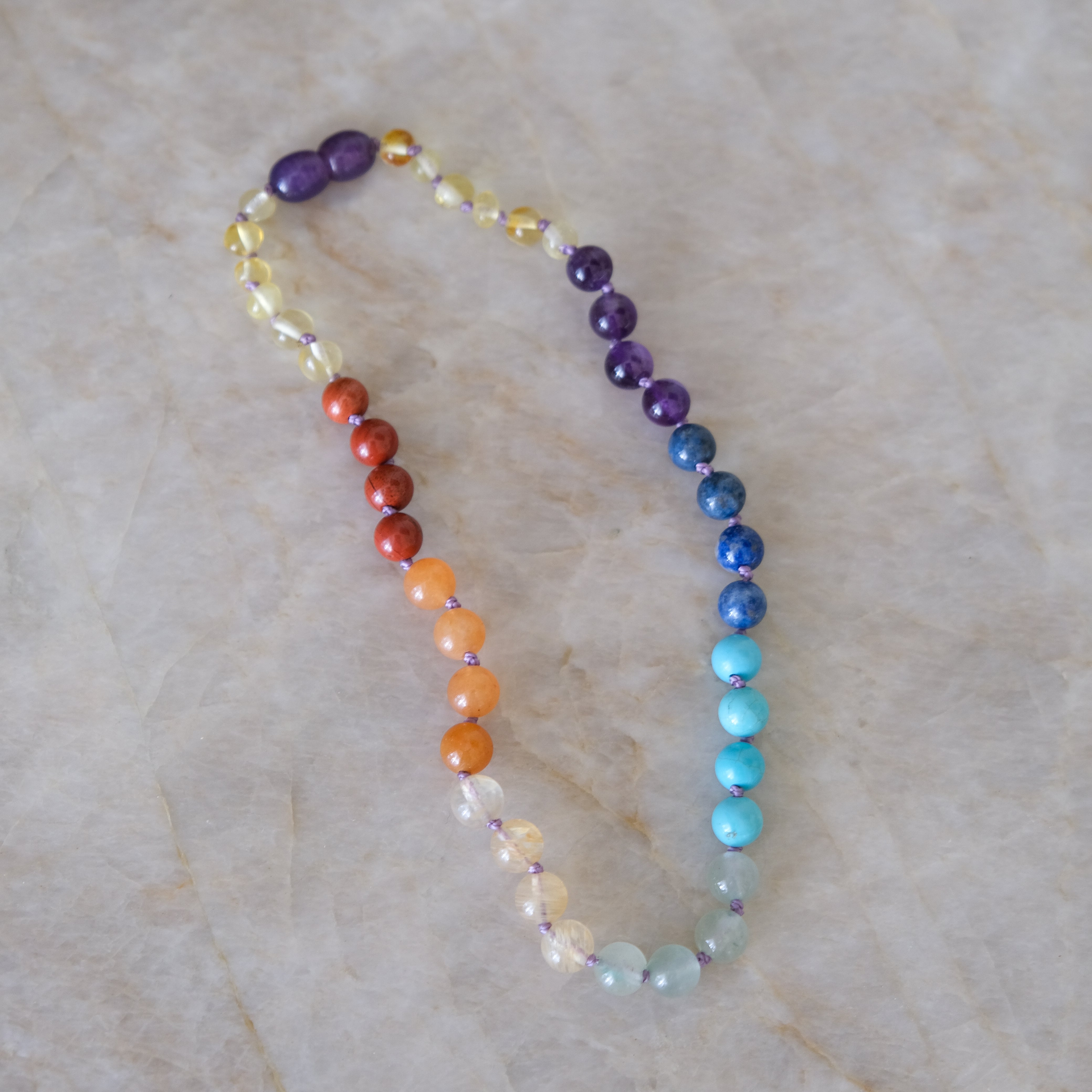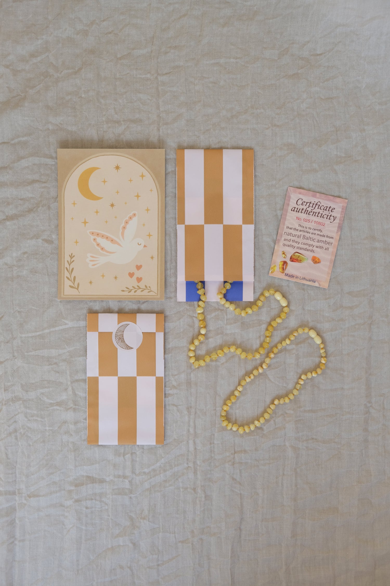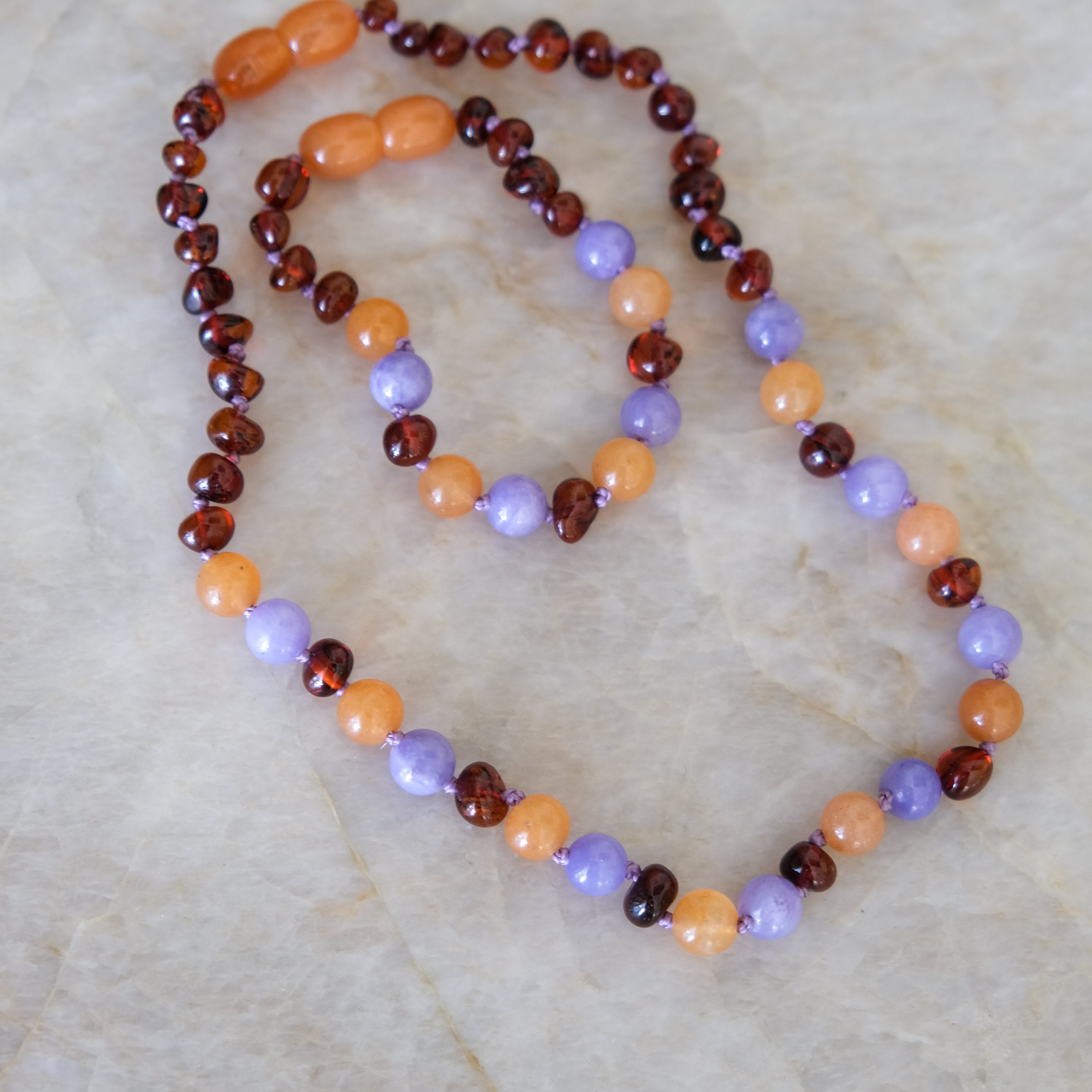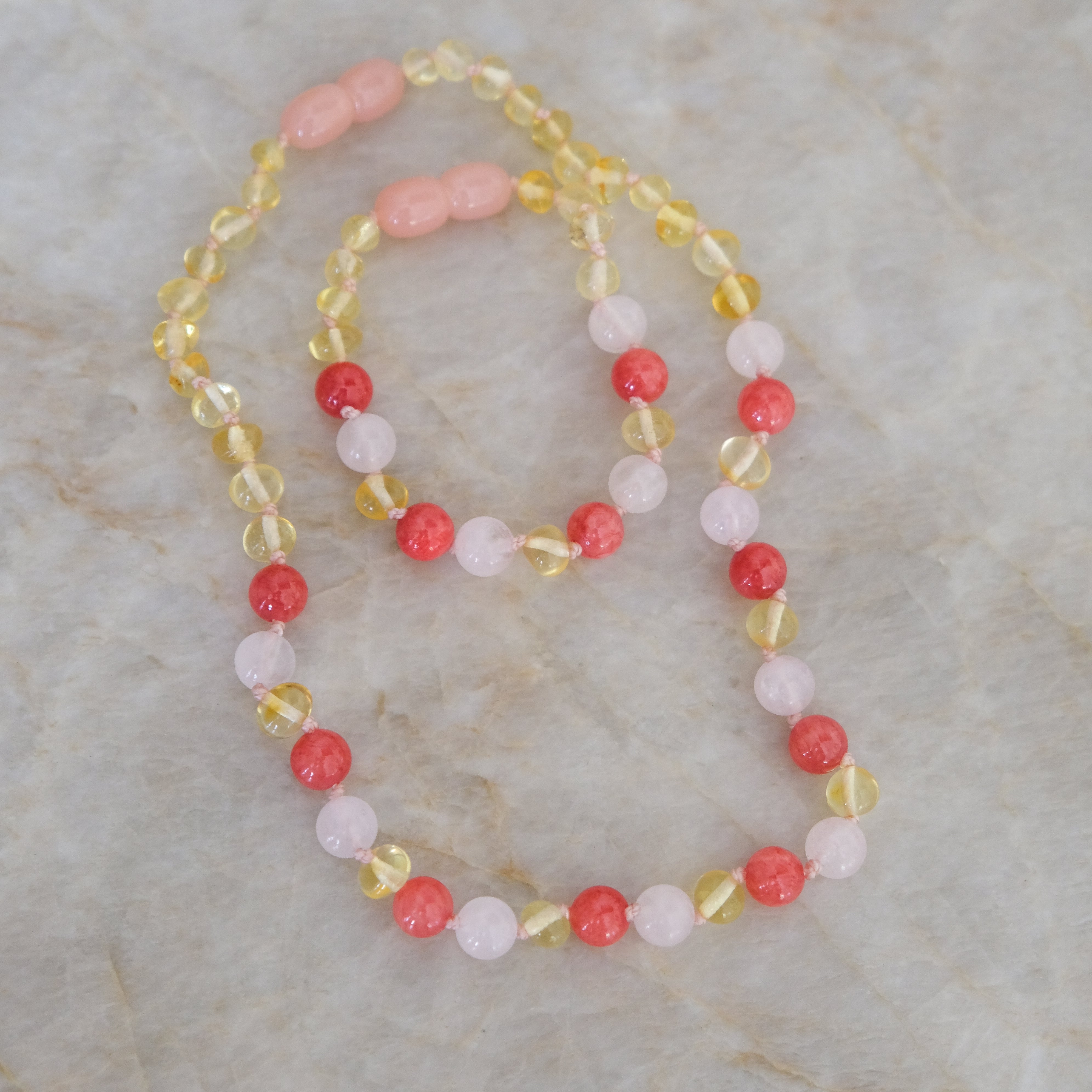 Onze sieraden variëren in kleur (cognac, honing, koraal) en zijn soms gecombineerd met edelstenen zoals aventurijn, kwarts of jade. Zo vind je altijd een stijl die bij jouw kindje past.