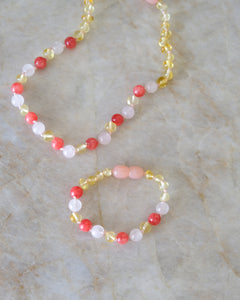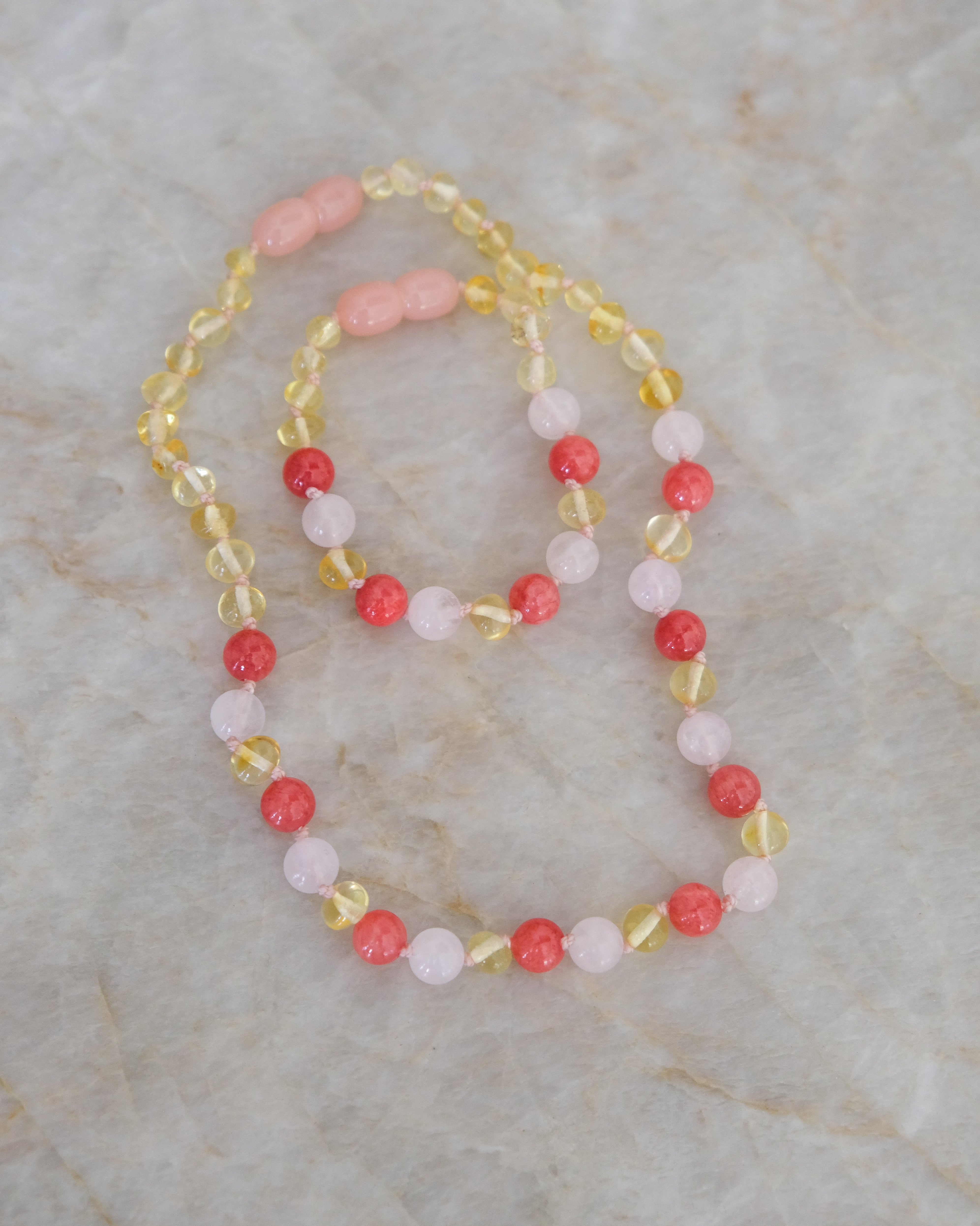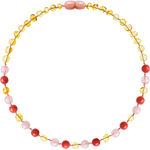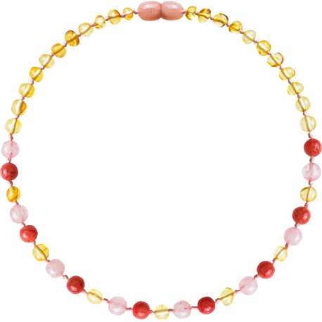 Barnsteen ketting voor baby/peuter in lemon, rozenkwarts en koraal.