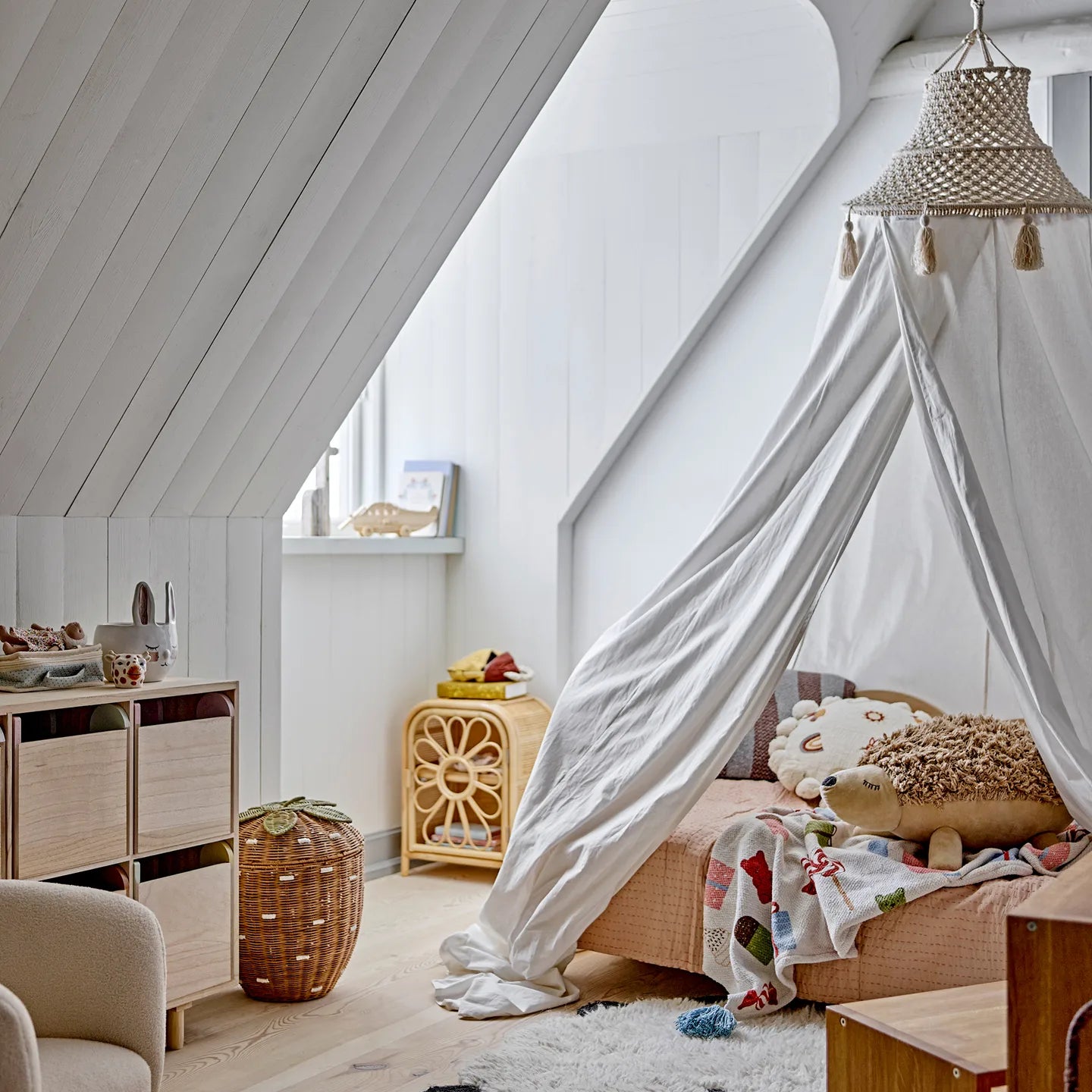 De meeste producten zijn gemaakt van natuurlijke en duurzame materialen zoals hout, zeegras, rotan en katoen. Alles is met zorg afgewerkt zodat kinderen er veilig mee kunnen spelen en het jarenlang mooi blijft in de kinderkamer.