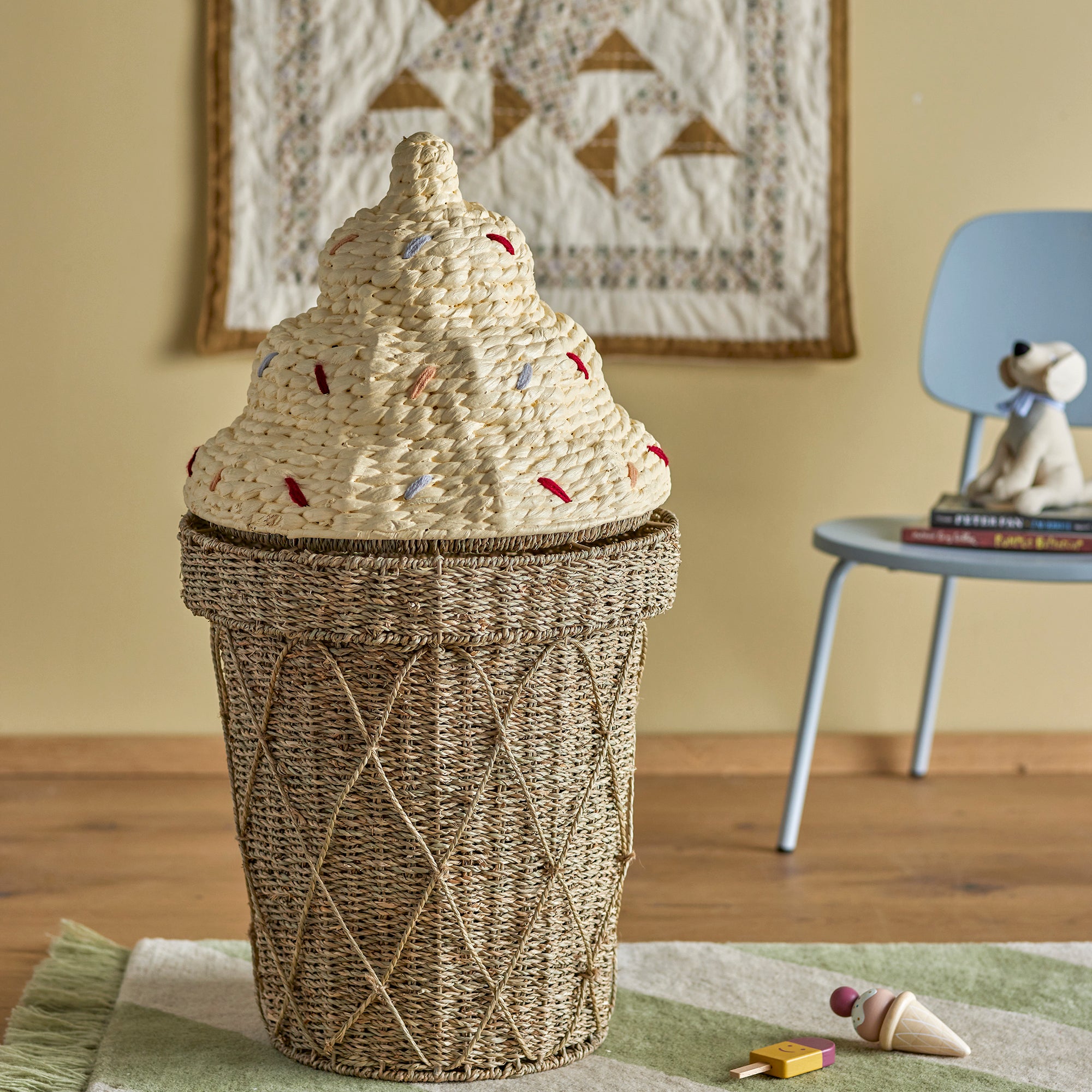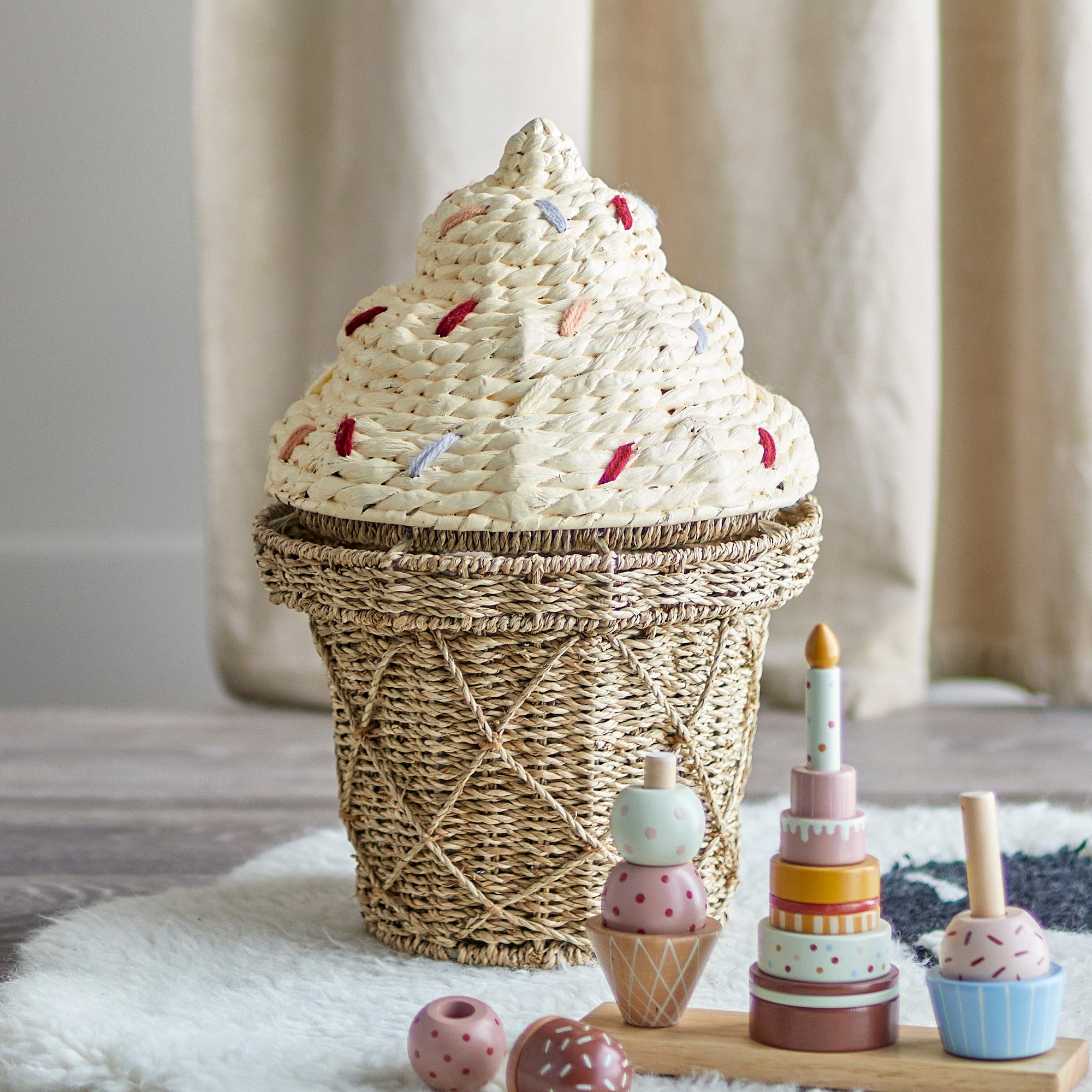 Bloomingville MINI brengt de magie van Scandinavisch design naar de kinderkamer. Het Deense merk staat bekend om zijn speelse vormen, natuurlijke materialen en zachte kleuren die perfect passen in moderne interieurs. Van vrolijke opbergmanden in de vorm van aardbeien, ijsjes en raketten tot charmante houten kapstokken, decoratieve luchtballonnen en schattig speelgoed , elk item stimuleert de fantasie en maakt opruimen of spelen net een beetje leuker.