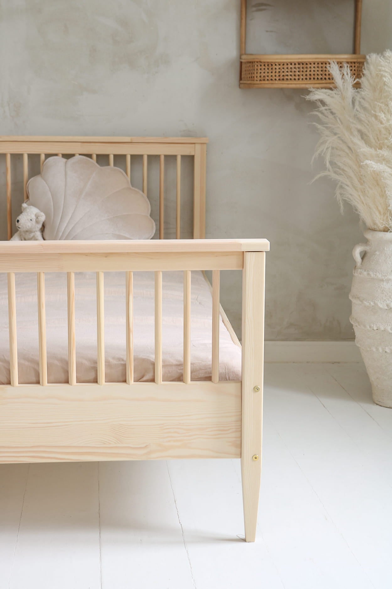 Het bed is gemaakt van grenenhout in de natuurlijke houtkleur, glad geschuurd.