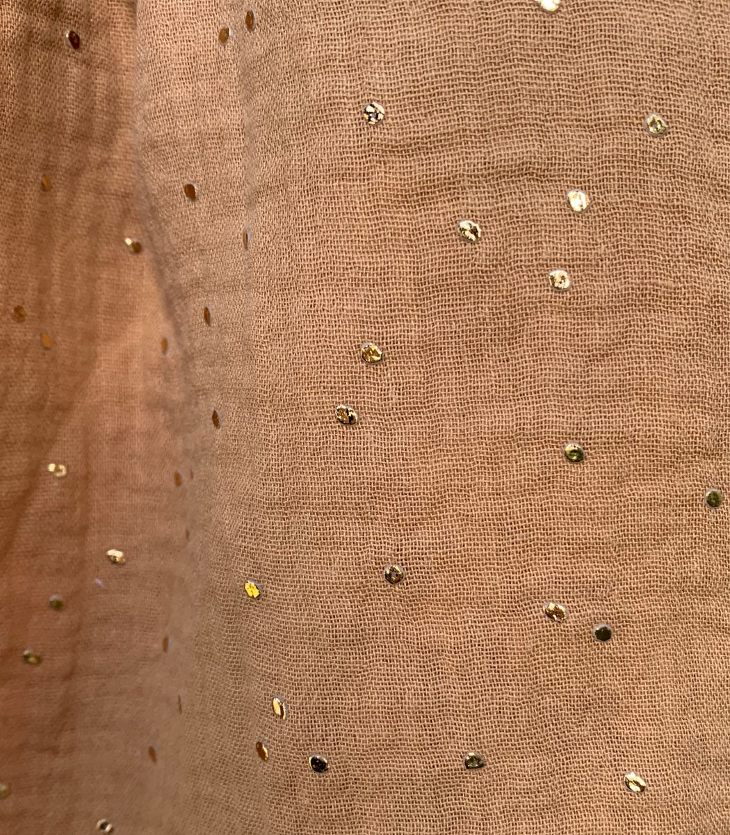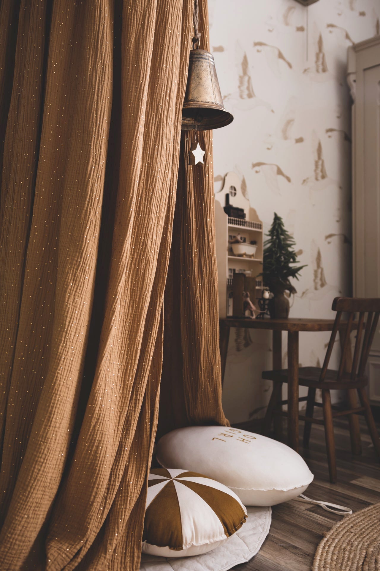 Mooie bedhemel gemaakt van Mousseline katoen in de kleur camel. De bedhemel heeft subtiele glitters in het goud.
