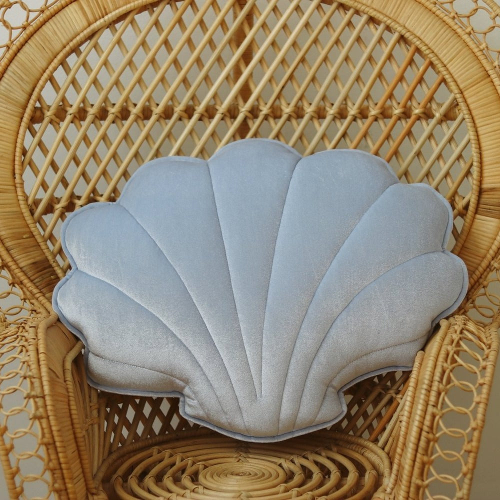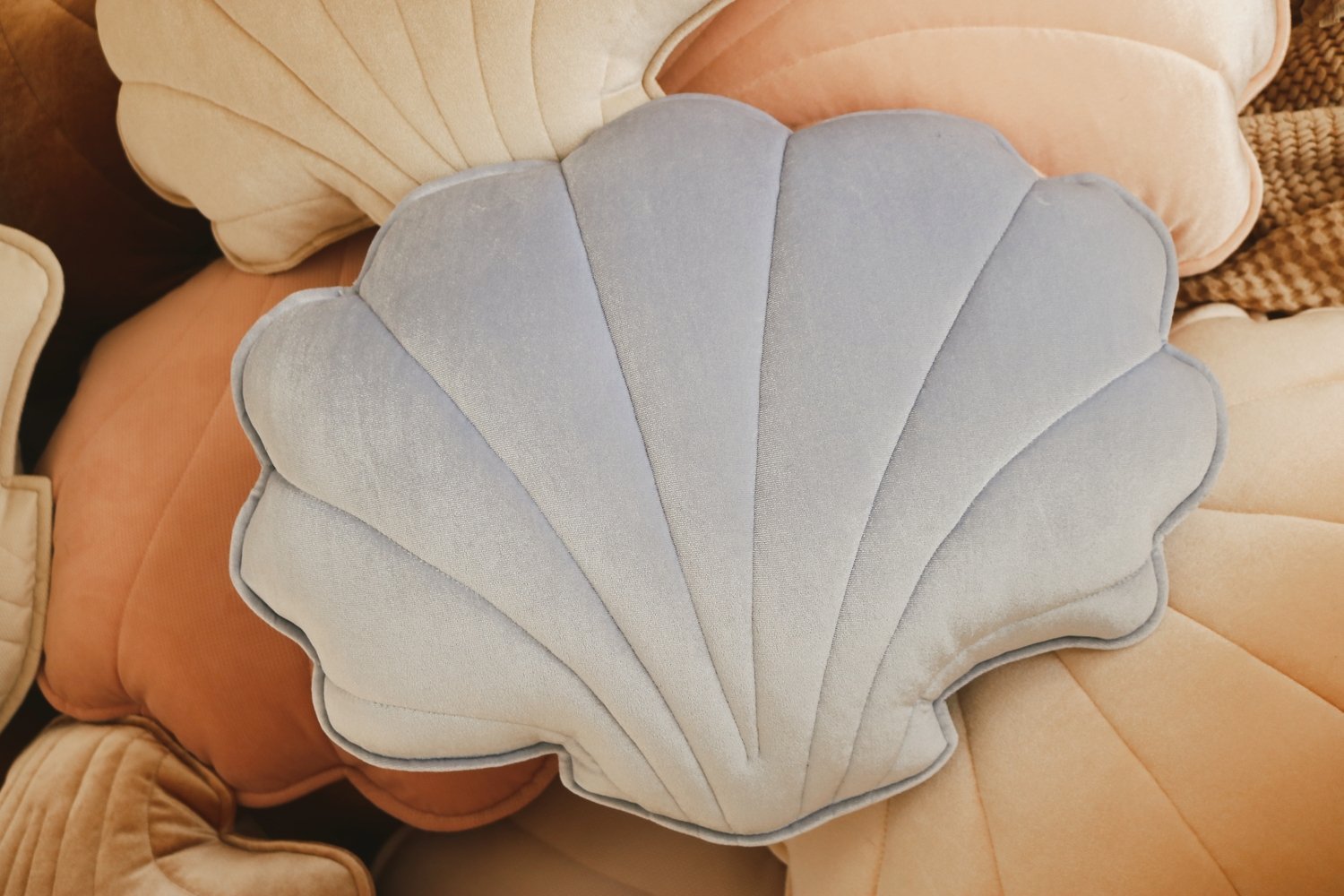 Een prachtig zacht schelpvormig kussen, zorgvuldig genaaid van hoogwaardige fluwelen stof in de kleur “blue pearl” die prachtig ligt en glanst. Super zacht om aan te raken, voor de slaapkamer en de woonkamer.