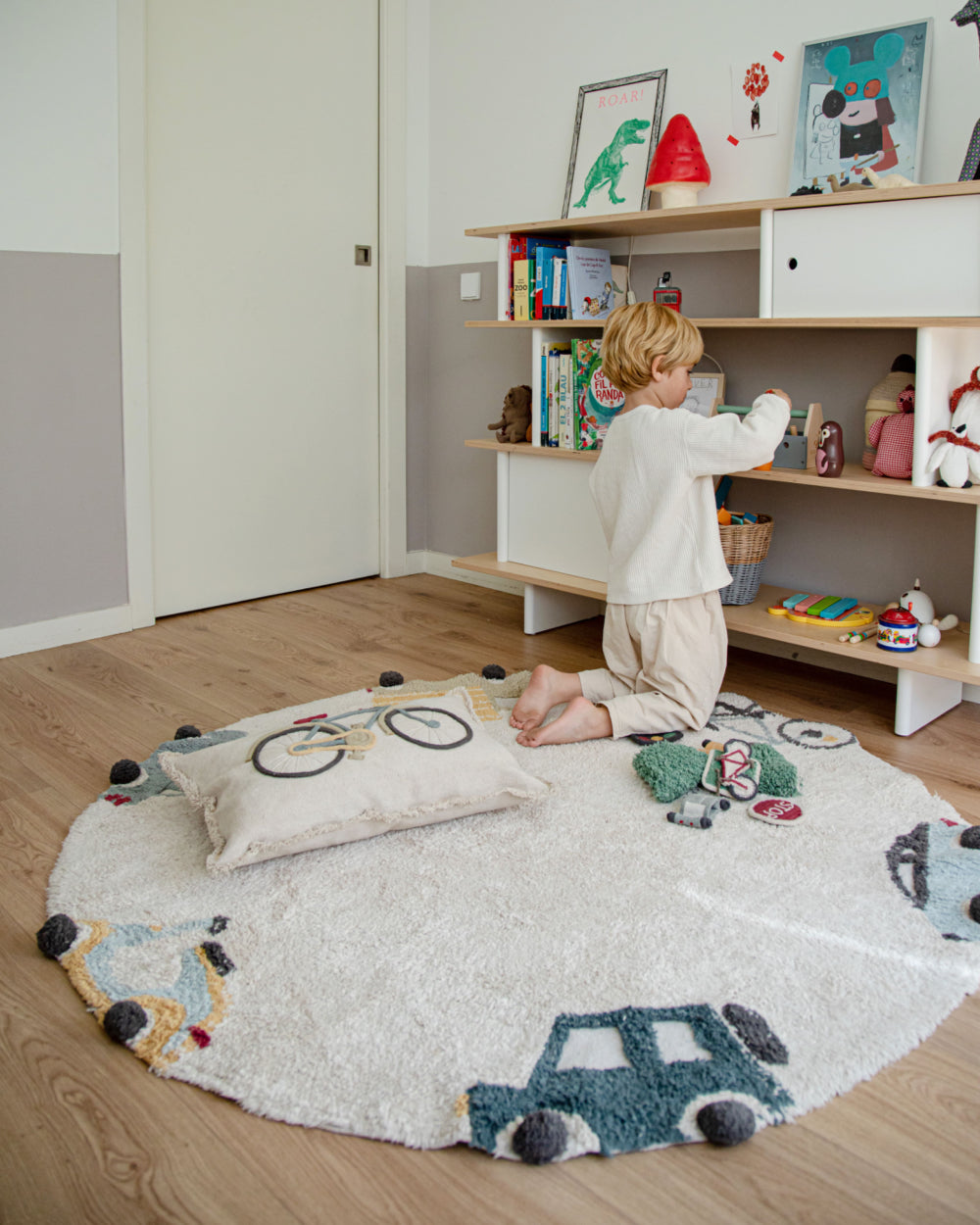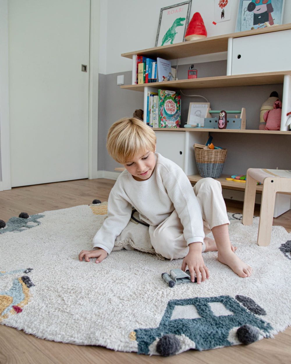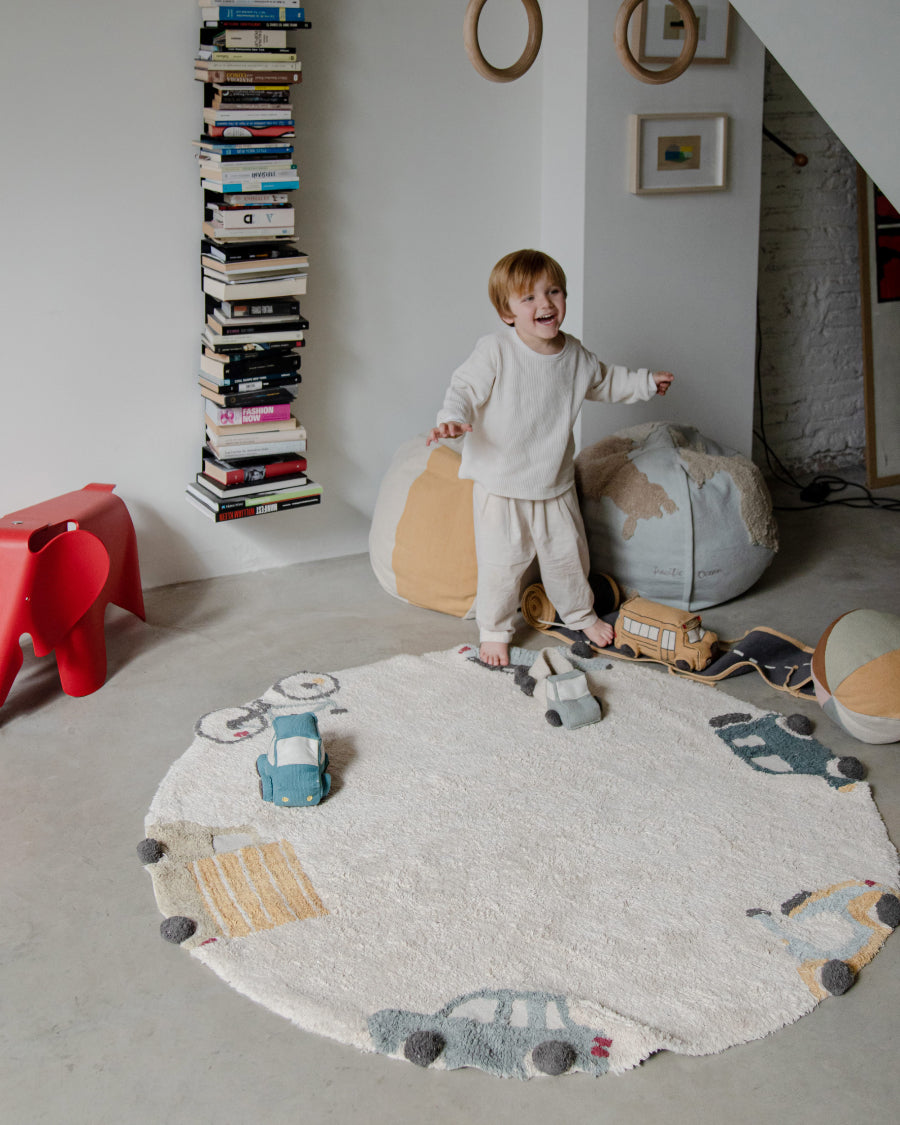 Laat de verbeelding de vrije loop met dit zachte, ronde en wasbare vloerkleed in de kleur naturel met accentkleuren. Dankzij het handige formaat is het overal in huis neer te leggen. Perfect om de kinderkamer of babykamer stijlvol aan te kleden. Wie stapt in voor wat vroom-vroom plezier?