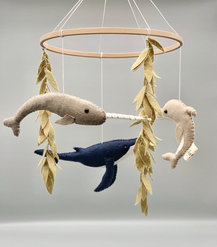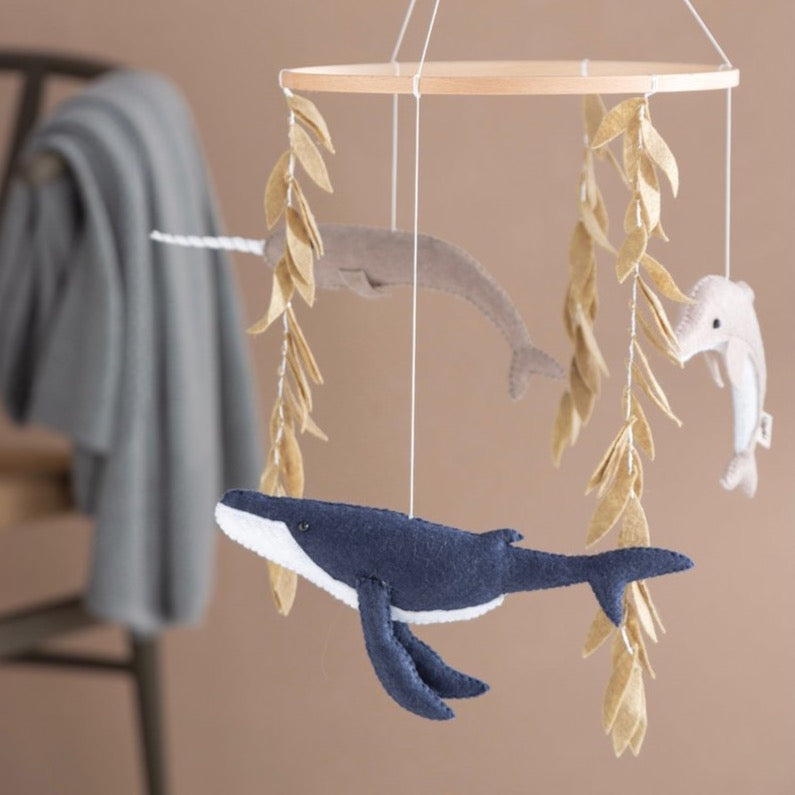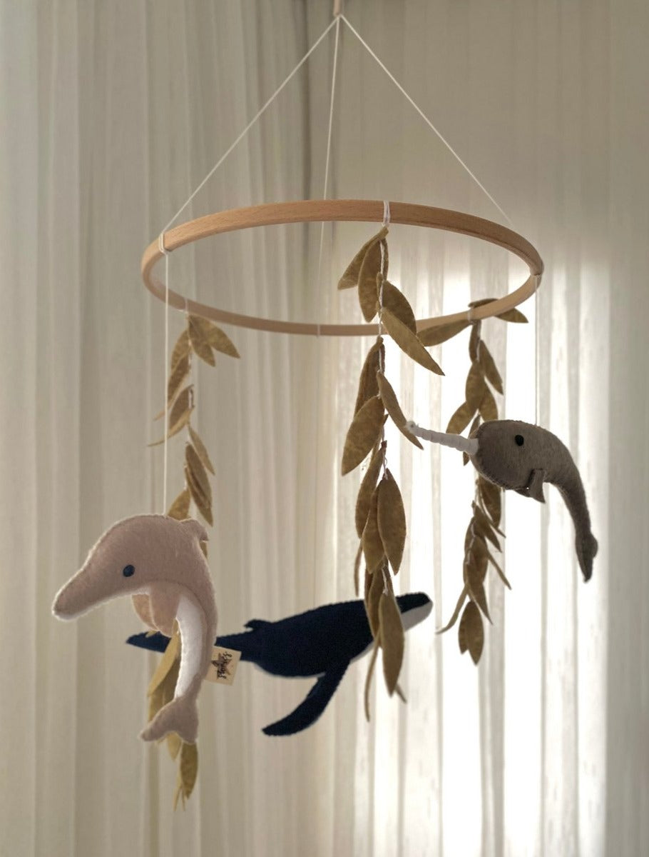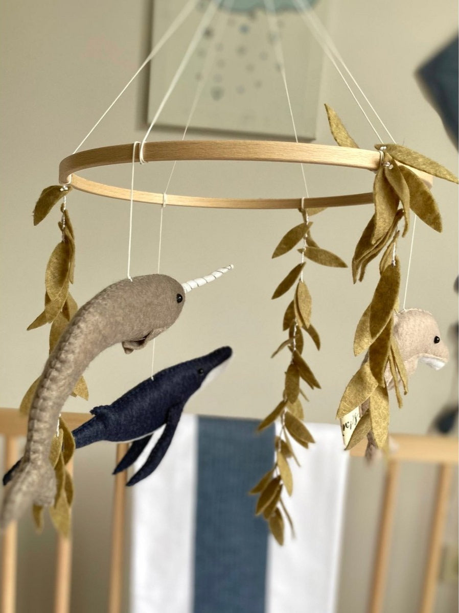 Breng de schoonheid van de oceanen in de kinderkamer. Deze 100% handgemaakte wolvilt mobiel is geïnspireerd op prachtige zeedieren en planten. Het bestaat uit 3 verschillende soorten vissen en een onderwaterplant. Elk product is uniek omdat ze handgemaakt zijn, dus ze kunnen van elkaar verschillen.