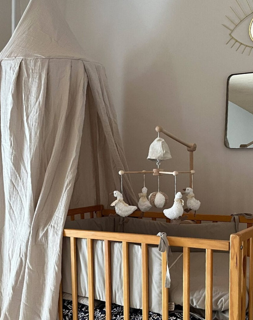 Mooie handgemaakte ganzen muziekmobiel. Deze mobiel komt compleet met een draaiende muziekdoos, mobiel en houten mobiel houder!