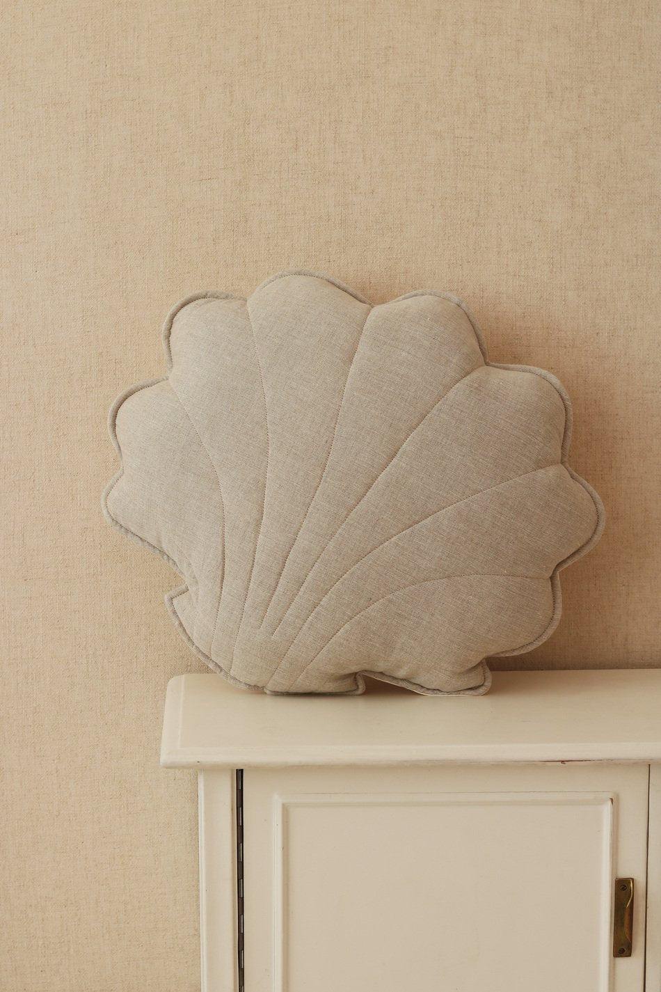 Een prachtig schelpvormig kussen, zorgvuldig genaaid van hoogwaardig woestijnzand kleurig linnen. Comfortabel, casual, relaxed.