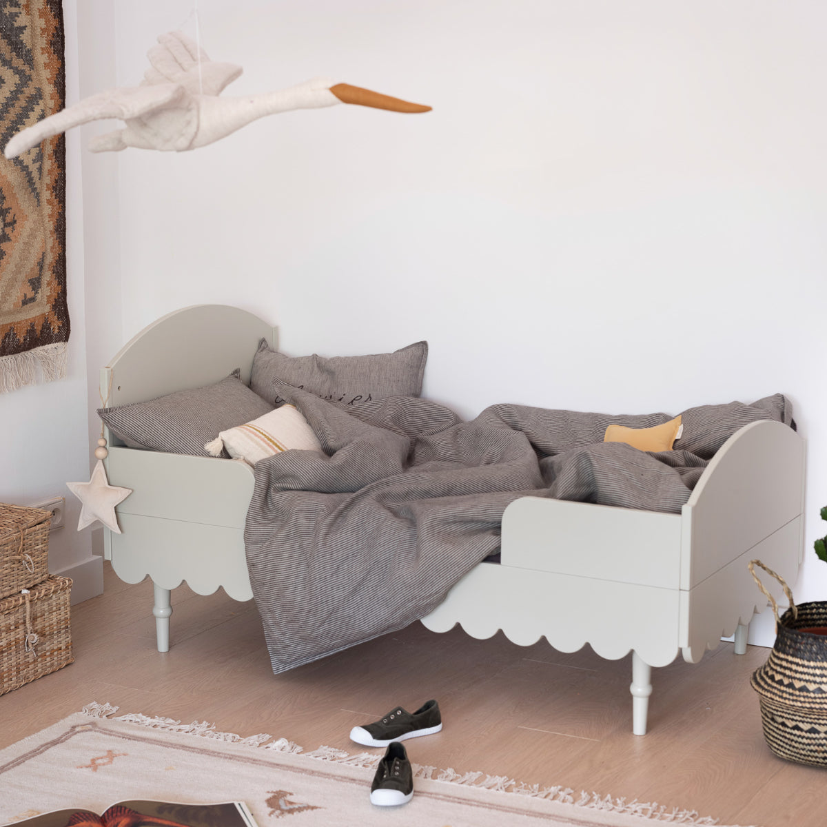Het matras kan op 3 niveaus worden aangepast, een van de zijframes heeft 3 afneembare spijlen zodat een ouder kind zelfstandig uit het bedje kan komen. Het is uitgerust met extra elementen die het ombouwen tot een kinderbedje voor een ouder kind mogelijk maken. Het heeft bescherming tegen uit het bed vallen. Geschikt voor matras maat: 70x140 cm.