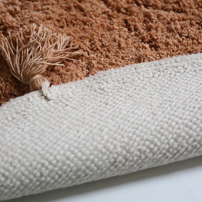 De lichte achtergrond wordt speels geaccentueerd door decoratieve kwastjes langs de rand, wat het tapijt een uitnodigend en gezellig karakter geeft. Gemaakt van zacht katoen voelt het comfortabel aan onder kleine voetjes en vormt het een fijne basis om op te spelen, lezen of weg te dromen.