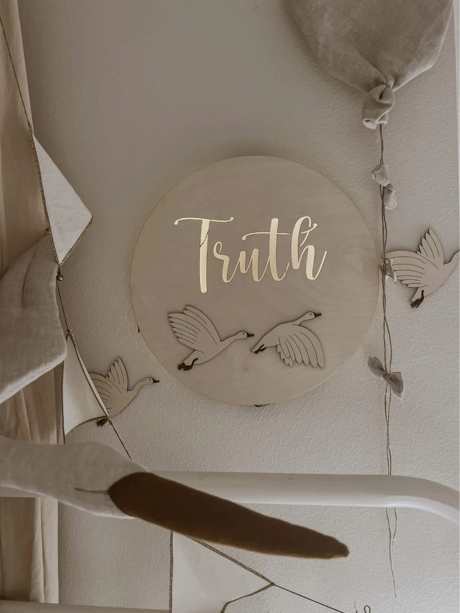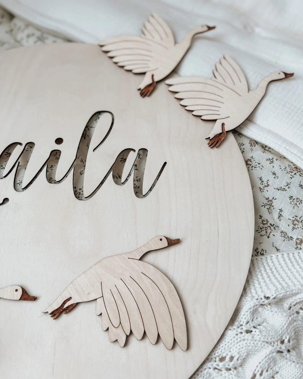 Prachtige houten wandlamp met ganzen, gecombineerd met de naam van jouw kind (of een eigen tekst). De lamp heeft de vorm van een cirkel.
