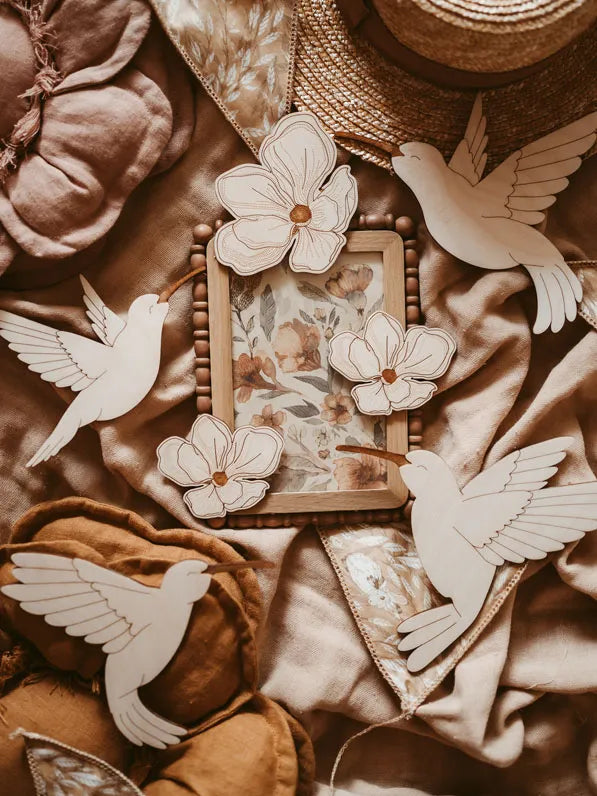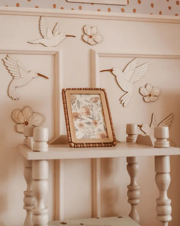 Prachtige houten muurdecoratie met kolibries en bloemen. De set bevat 4 houten kolibries en 3 houten bloemen.