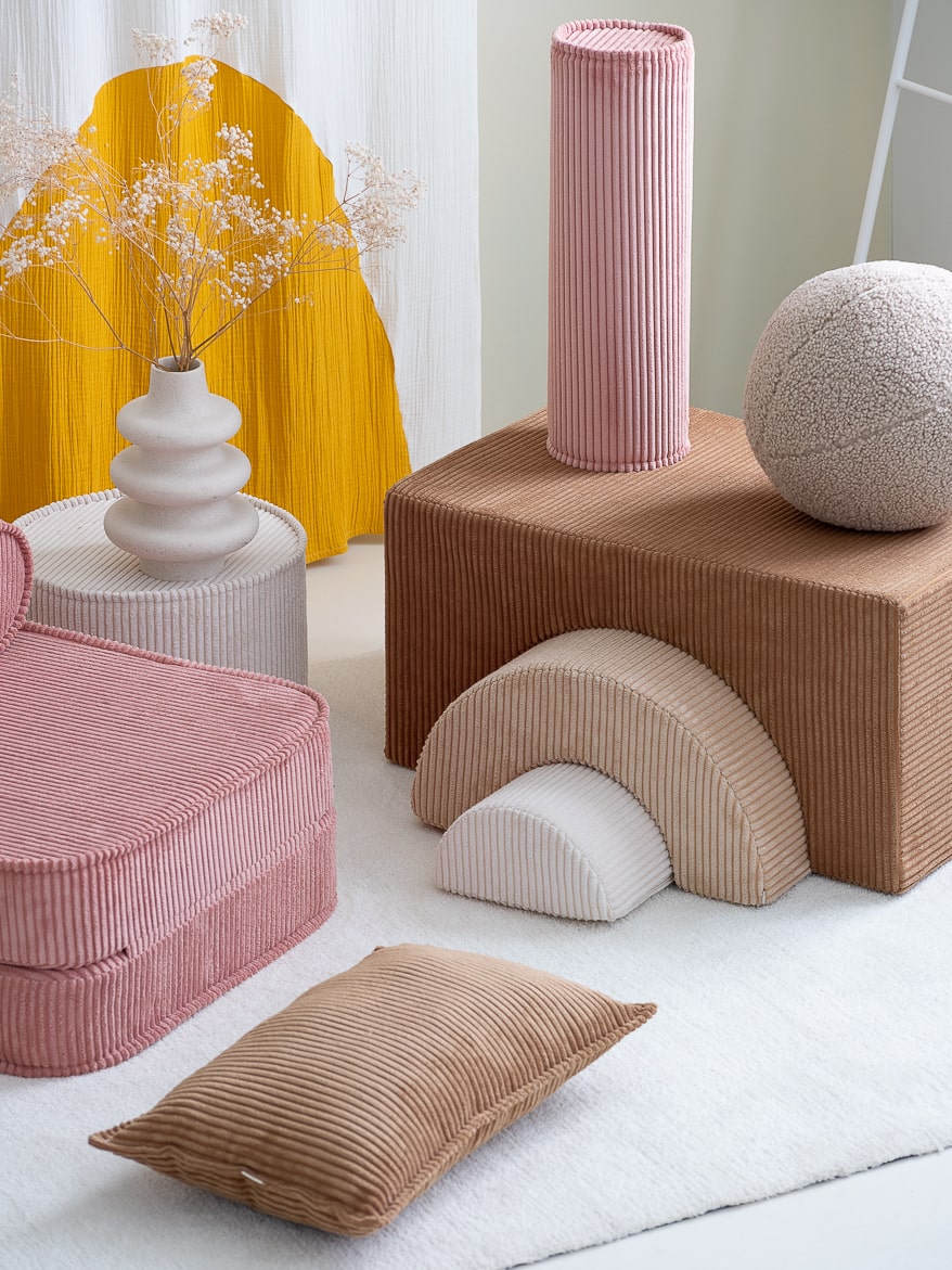 Deze stijlvolle en comfortabele speelset is verkrijgbaar in de volgende kleuropties: brown sugar, pink mousse, peppermint green, blueberry blue, marshmallow en toffee.