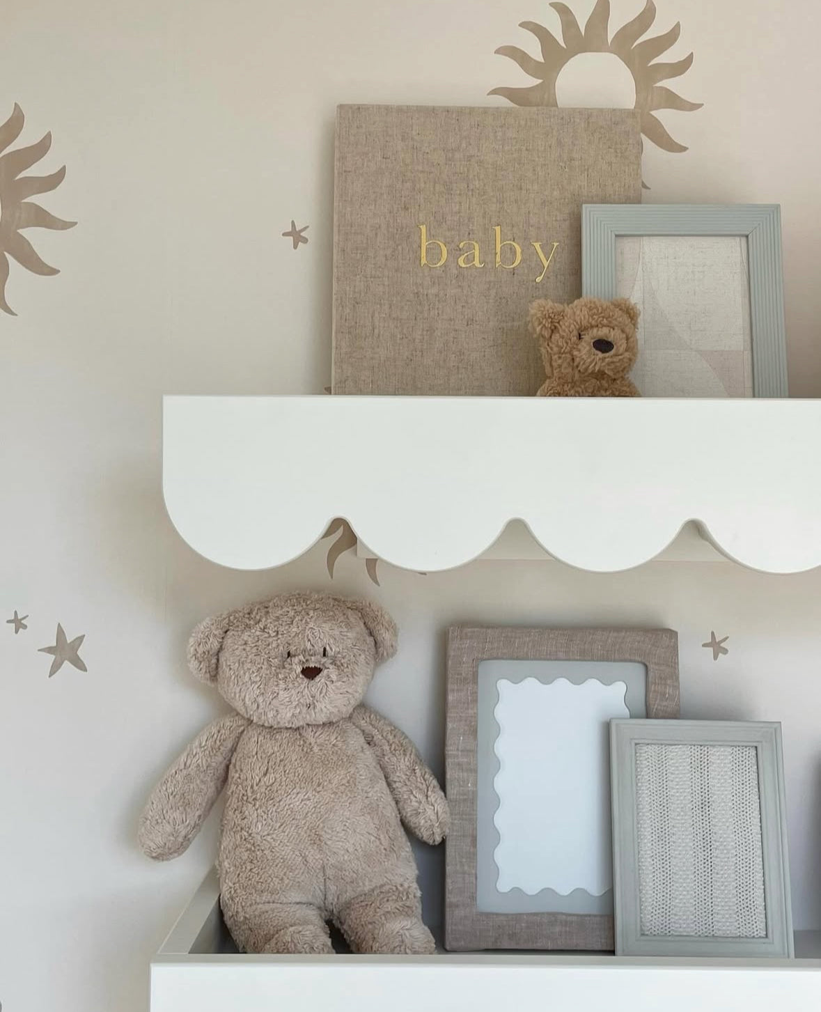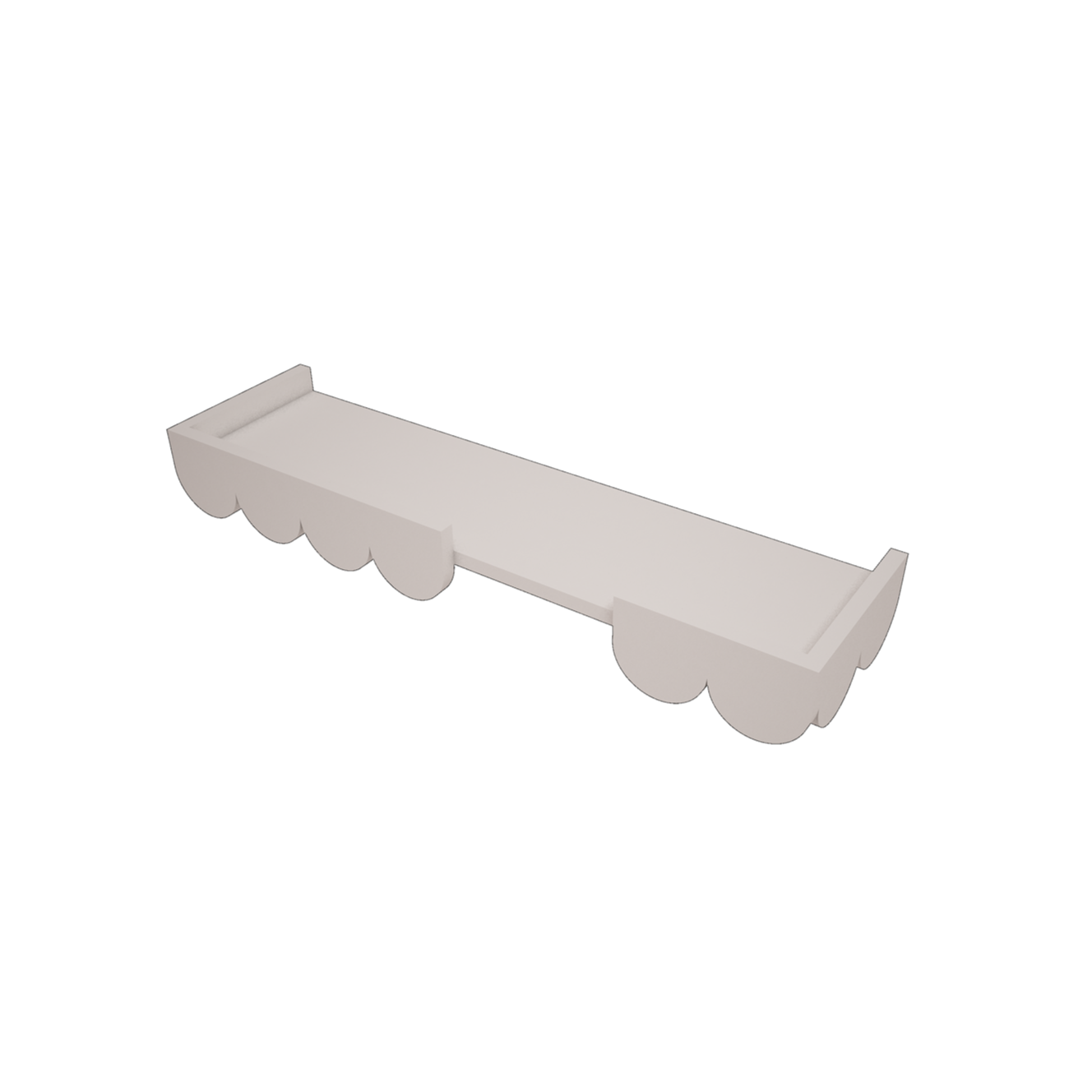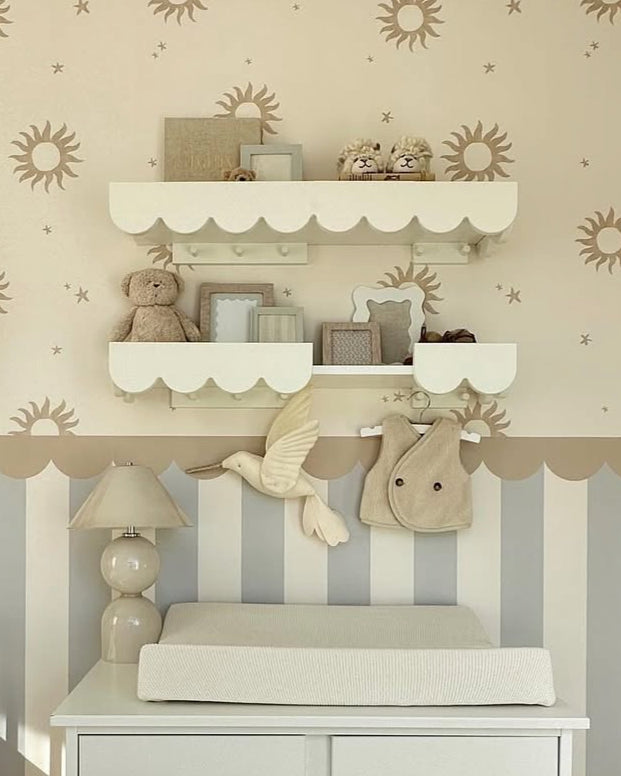 Wandplank met schulpenrand met 5 kapstok haakjes eronder. De geschulpte rand is kenmerkend voor de Babushka lijn van Wood Luck. De wandplank staat bijvoorbeeld mooi boven een Wood Luck commode.