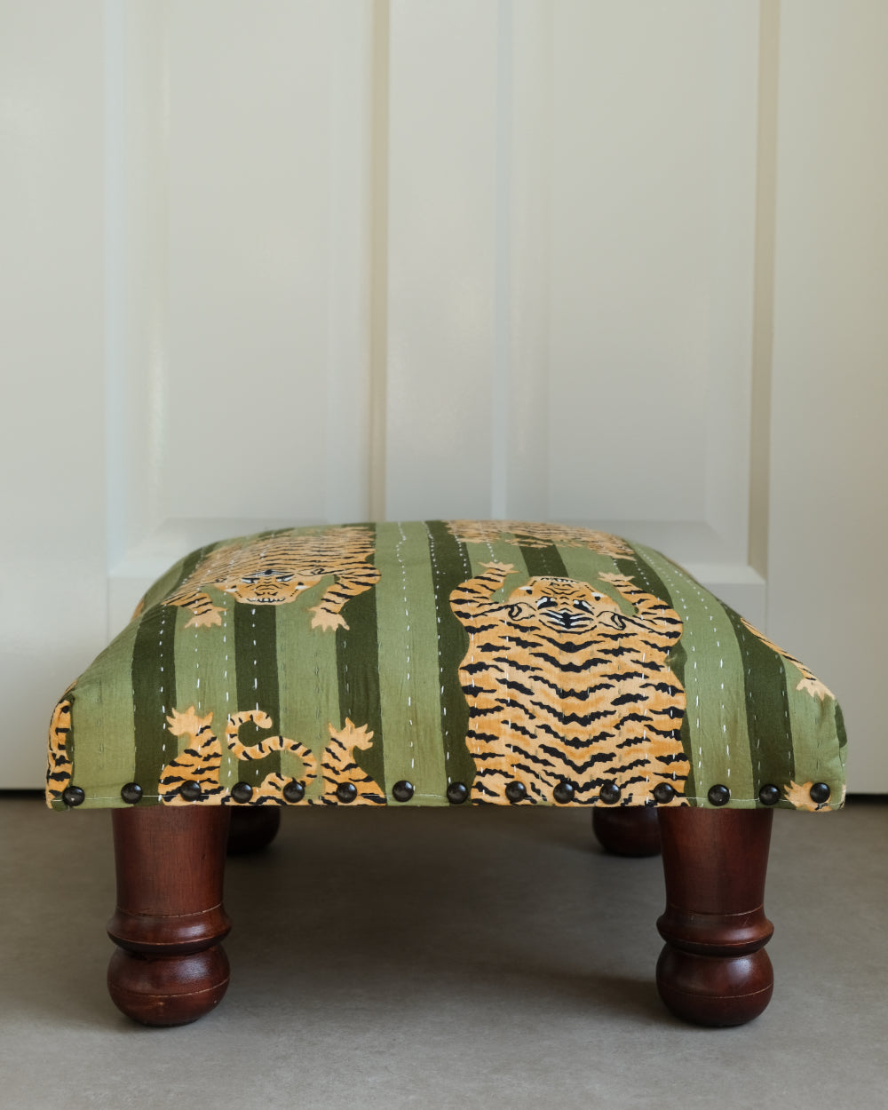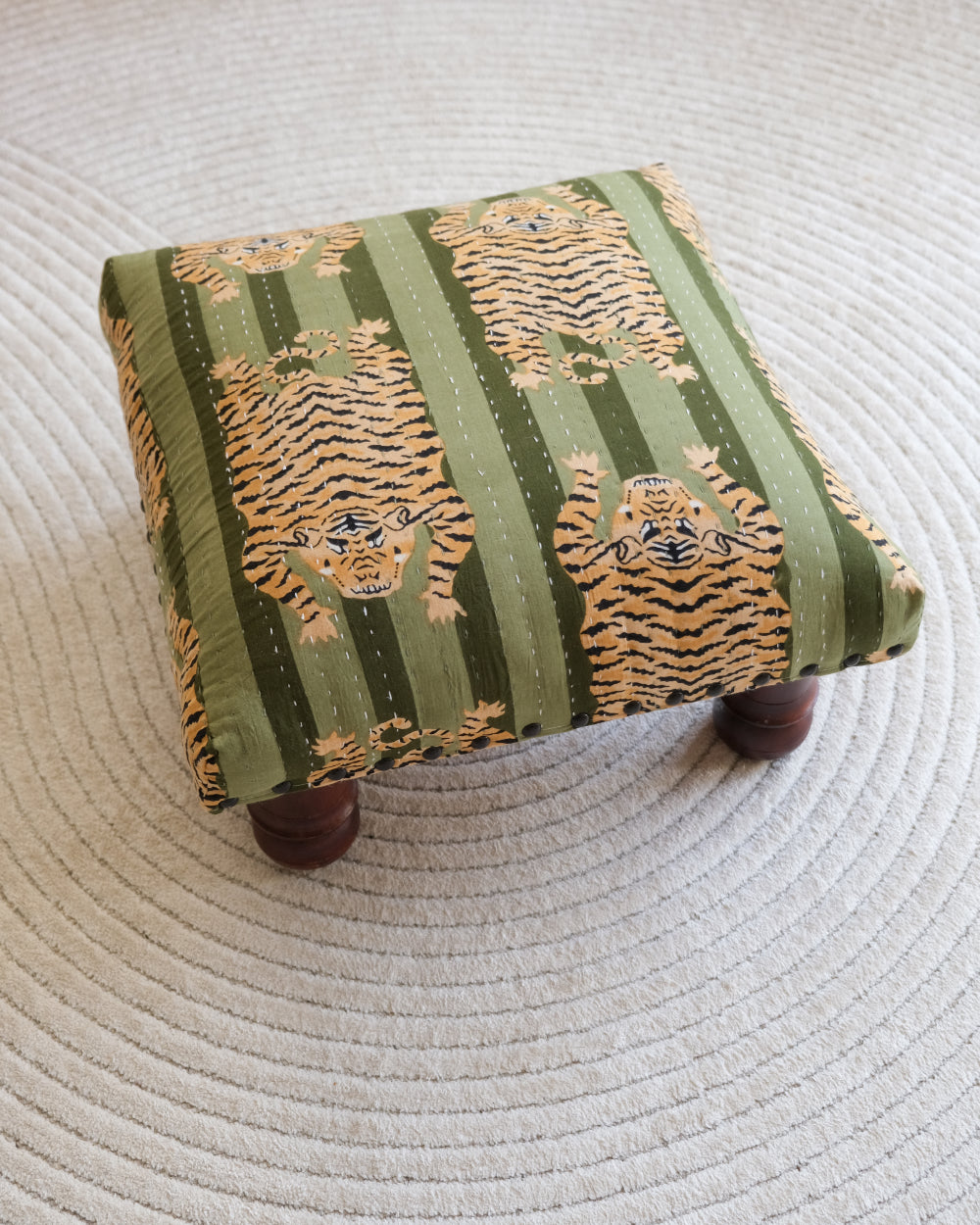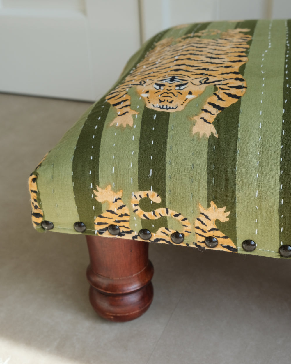 "Poef Tijger - Groen" is een poef met elegante houten pootjes en een zitvlak bekleed met een handgestikte, prachtige stof, met een dessin van groene strepen en een Oosterse tijgerprint.
